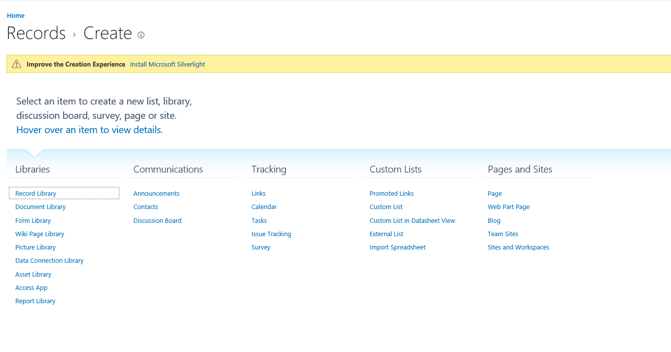 Well I’m just goin to use the out of the box Record Library that is created by the Records Center Site Template.
