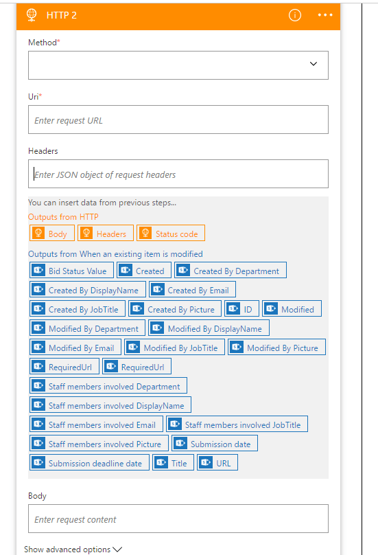 Now, I added an HTTP step. When you add the first HTTP step you will not get the Orange outputs ( body, Headers, Status code).