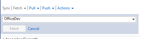 OK, so now I’ve got git to know about OfficeDev, then I tried in Visual Studio to merge branches but Visual Stuido doesn’t seem to pick this up. It only knows about origin.