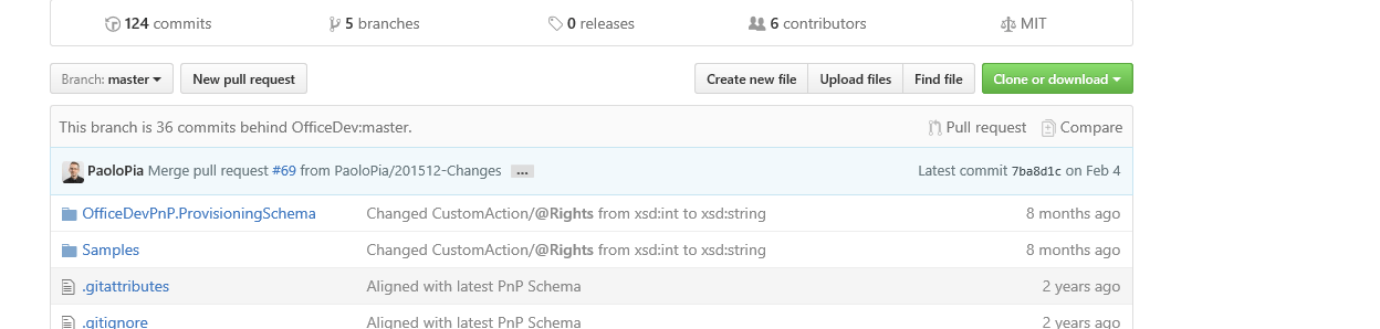 Now I had to select which branch to merge from and I selected OfficeDev/master which is the master branch. So this code matches the latest release code. When needed you might want to select development branches here. In the other two projects (PowerShell and Core) there is a clear branch called dev.
