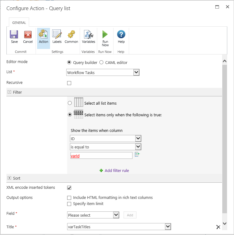 I’ve then tried creating a site workflow. First I made sure that it is easy to find my document by adding the document ID to the Name of the task.