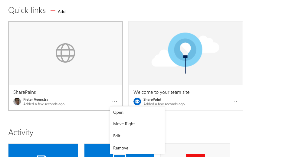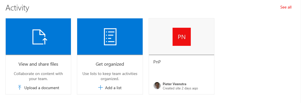 The last default web part available on the new team sites is the activity web part. The Activity web part shows the most recent 10 activities on the team site. Making it easy for team members to catch up.