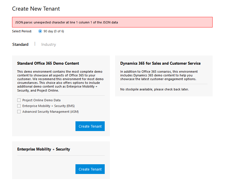 Also when trying to create a new demo tenant things don’t really go as expected. when you try to create a new tenant the message:
