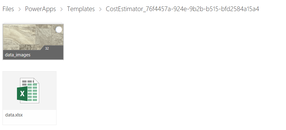 Ok, time to have a look at my OneDrive. I noticed a folder called PowerApps. In the PowerApps folder there is another folder Templates. then within the Templates fodler there is yet another folder, CostEstimator_Guid. So it looks like this system can handle multiple tenants and multiple templates to store their data within OneDrive.