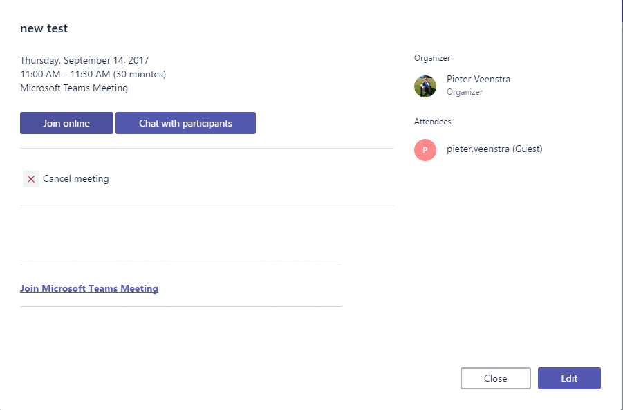 Within the invite you will have to copy the Join Microsoft Teams Meeting link and send your guests a meeting request in Outlook for now. Once I got this to work with my development and production account and I was able to have myself as guest in my meeting.