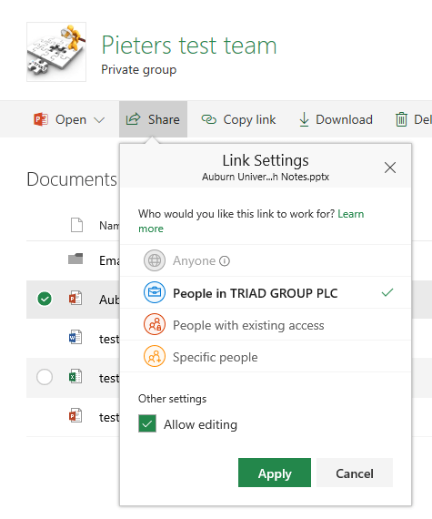 The odd thing is that apparently my organisation is preventing me from selecting this option. I’m not aware of any setting that can be made related to Sharing that is just for lists or libraries only.
