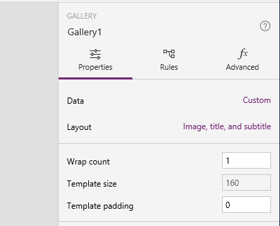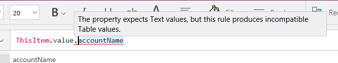 So in my Gallery control, I’m now running the ListAccounts. ( I could have done something like VisualStudioTeamServices.ListAccounts().value.accountName to get all the account names, but I’m connected to a few customer accounts and therefore for the purpose of the screenshots in this post I’ve simplified things a bit)