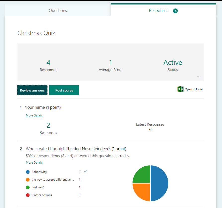 In my post before just before Christmas I created a Christmas quiz in Microsoft Forms. Today I’m looking at the reports part of the Microsoft Forms quizzes.