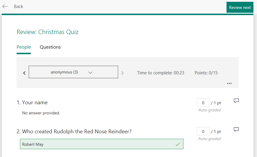 And this is where Microsoft Forms is started to look like a good product. There were a couple of questions where I didn’t supply an answer in my quiz. These are now all marked with Needs review.ย