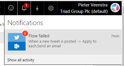 Once I saved my tweet the emails started to come in, but quite quickly I noticed the failed flow notification: