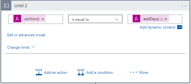 | Pause for Duration | A Pause can be implemented with an Do Until using the utcNow and addDays expressions:![]() |