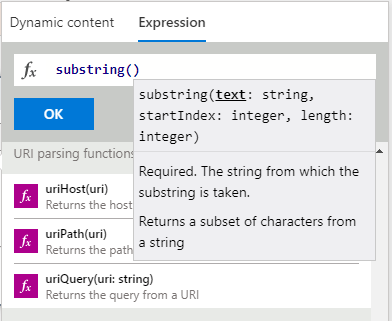 | Extract Substring from Start of String | Logic Apps and Flow have an expression substring available that can handle all of the substring actions in SharePoint Designer: |