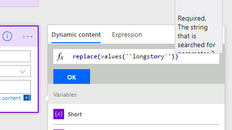 replace(variables(‘longstory’),variables(‘Long’),variables(‘Short’))