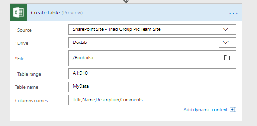 Ok, this is great!ย With all the other option available like adding row, get a row I’ve got yet another option to store my data in. Personally I don’t like storing data in spreadsheet. My main reason for this is that people build up their spreadsheets manually and spreadsheets easily become unstructured. However, using the data table structure in Excel is a great way to store data from Flow or PowerApps.