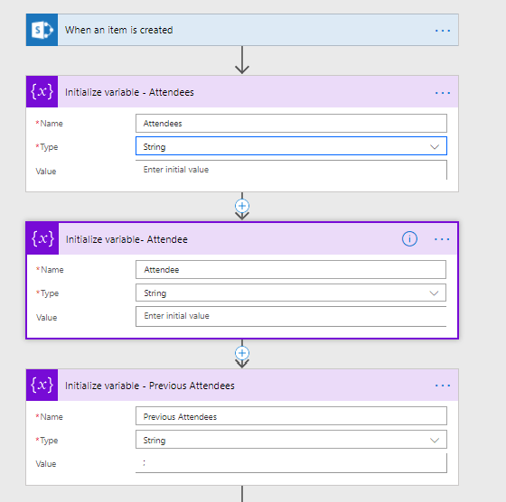 Again an Apply to each will appear, but this time I’m happy with that as I can now concatenate the attendees into a single string. It would be nice to just use 2 variables but it isn’t possible to assign a value to a variable using the value of the variable itself.
