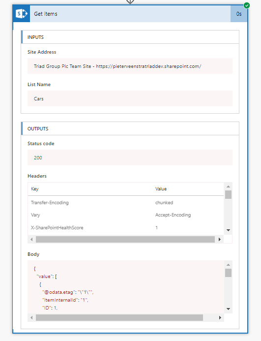 Using the Get Items action from the SharePoint connector I can now read the data from this list.